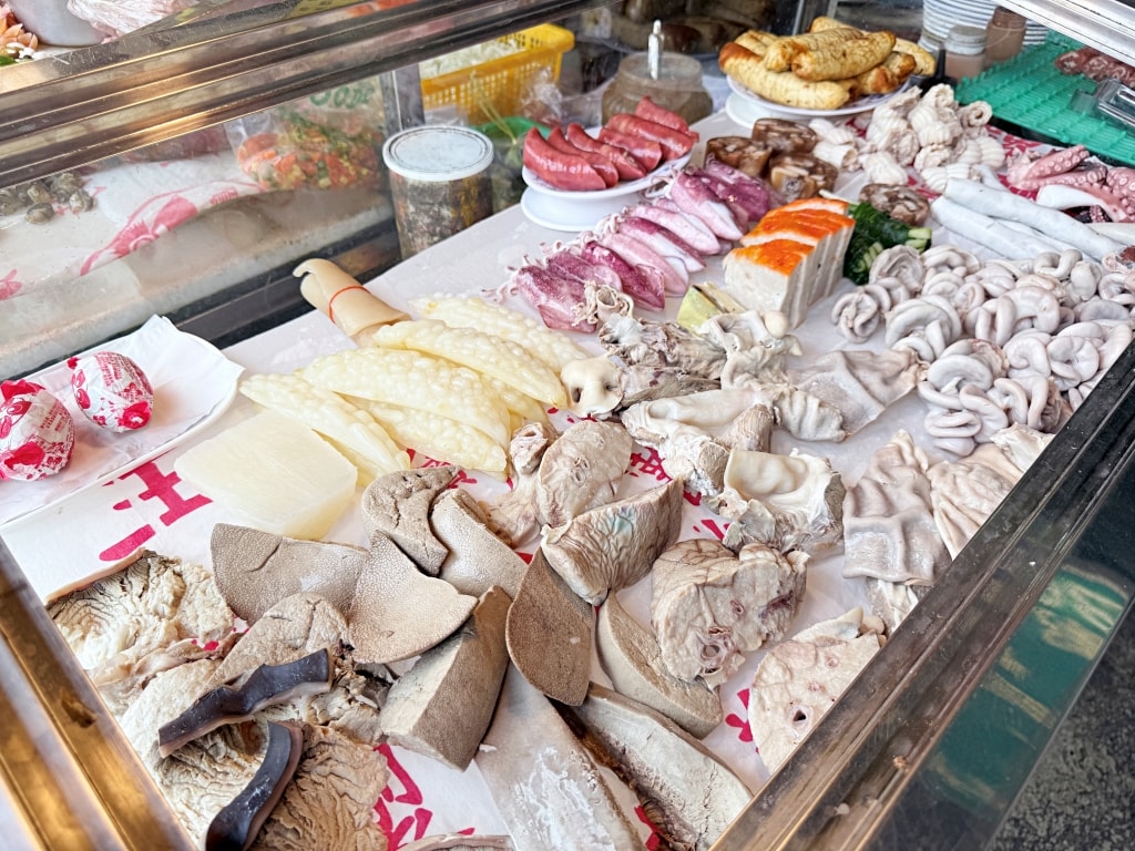 正味鱔魚意麵除了招牌的炒鱔魚、炒花枝以及炒腰子等餐點之外,種類超級豐富的香腸熟肉黑白切也令我們印象深刻,當日有的品項會乾淨整潔的擺放在櫥窗內讓大家自己選擇,光是用肉眼就能看出來食材有多新鮮,要不是我的胃口不夠大真想每一種都點來吃吃看