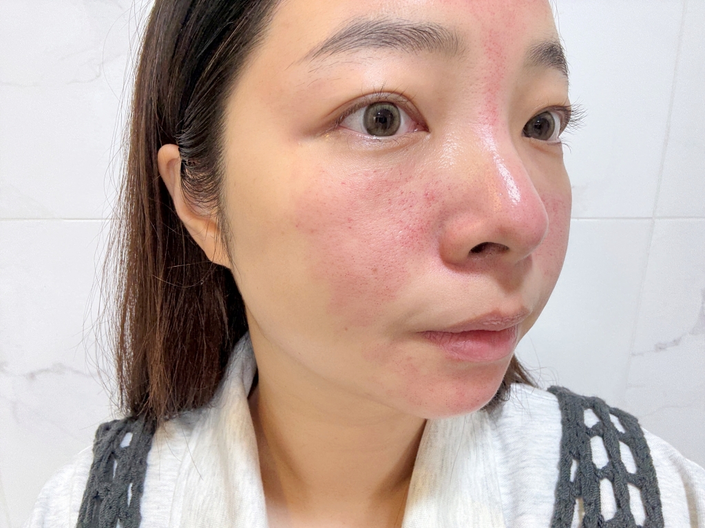 剛打完的肌膚狀況就是會這樣紅紅腫腫的,臉上會有很細微的傷口,修復期大約1~2周左右的時間。