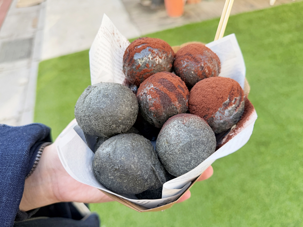 我們點了髒東西+原味的半半口味搭配一杯熱奶茶,奶茶的部分香甜不膩很滑順表現中規中矩,先嘗試了一口原味的黑心地瓜球,不得不說這個地瓜球的個頭是真的非常大,有如兵乓球大小還真的有點難一口吃下去,剛起鍋時的口感外酥內Q非常好吃,吃的到地瓜的天然香甜滋味,搭配香甜的煉乳及醇厚的可可粉更是迷人,因為使用的是甜度低的可可粉所以完全不會甜膩,簡直就讓地瓜球街邊小吃昇華成精緻甜點了!