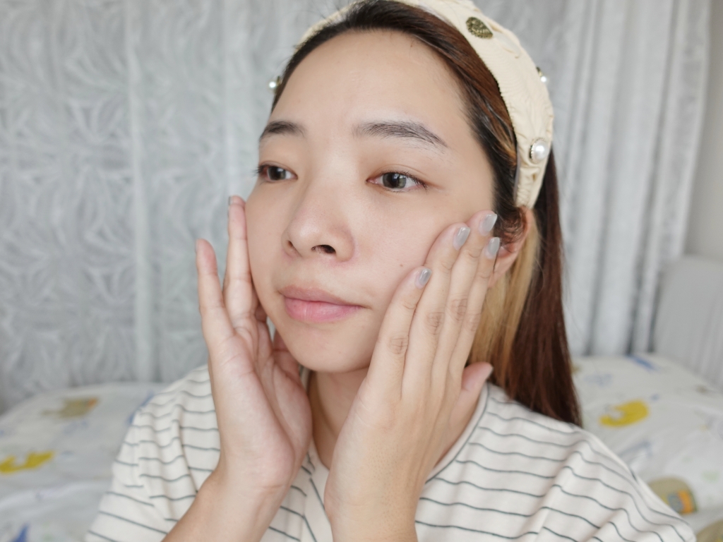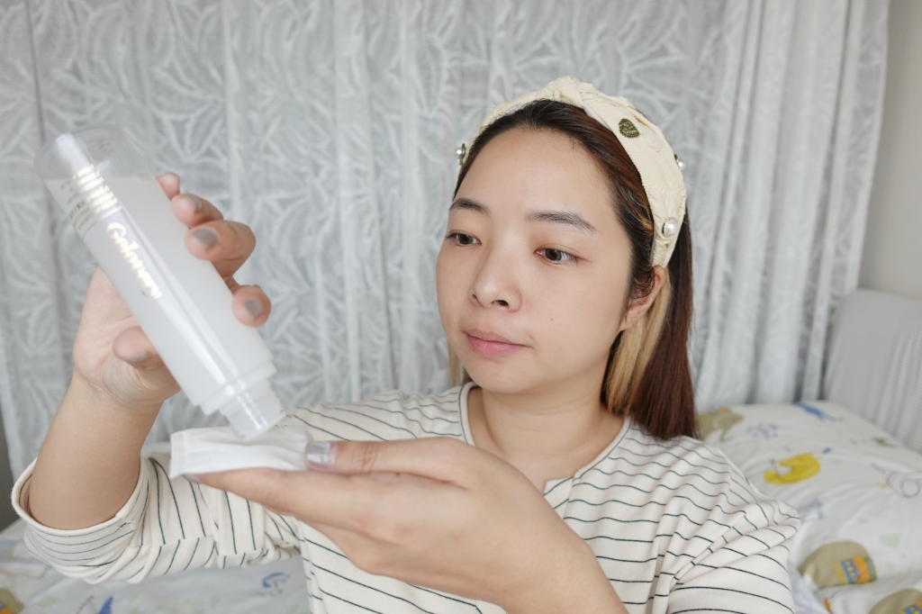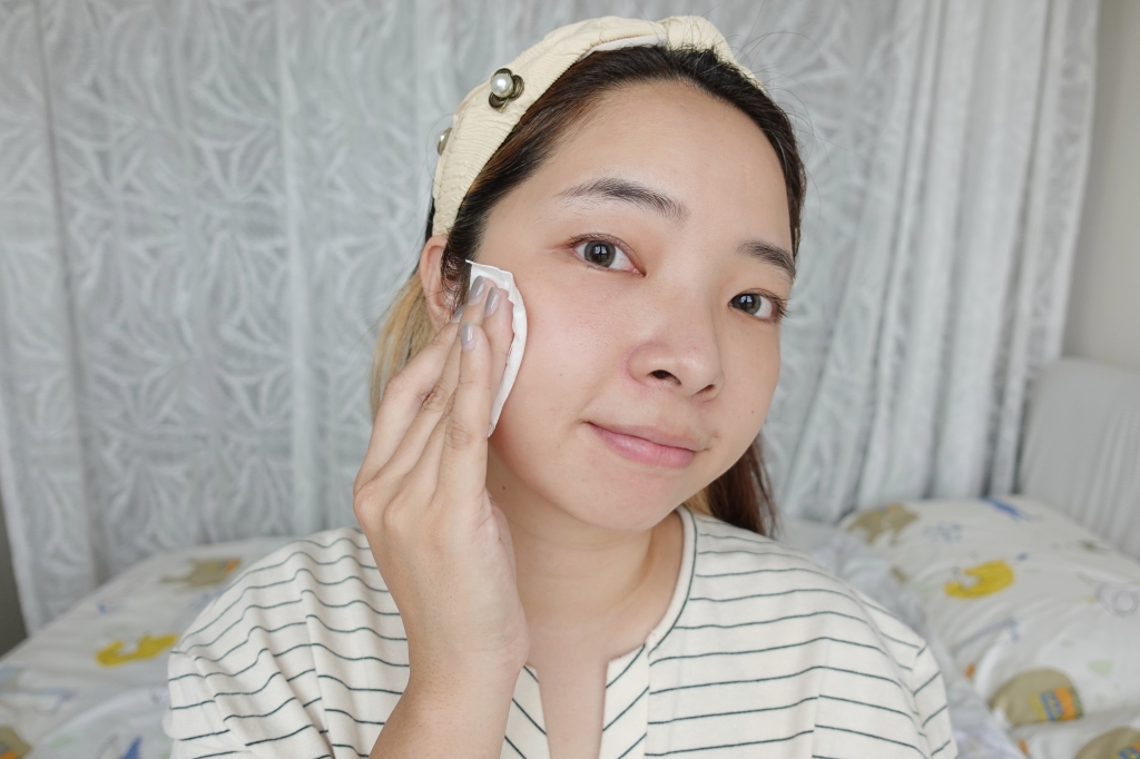 我本身是屬於時乾時油的混合肌,因為前一天睡前已經有清潔保養過肌膚,所以早上起床只用清水洗臉避免過度清潔,擦乾水分後會用PDRN玻尿酸精華水凝露搭配化妝棉在臉上輕柔的畫圈按摩,去除臉上髒汙的同時也能喚醒肌膚。